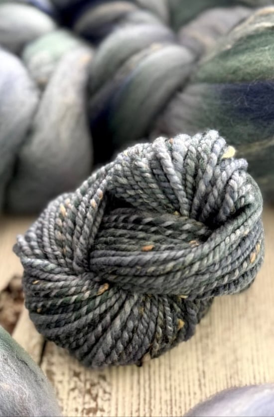 Rain Cloud, on Spindelicious Tweed: 89% Shaniko Wool/6% Acrylic/5% Rayon